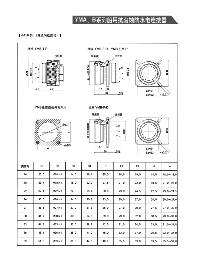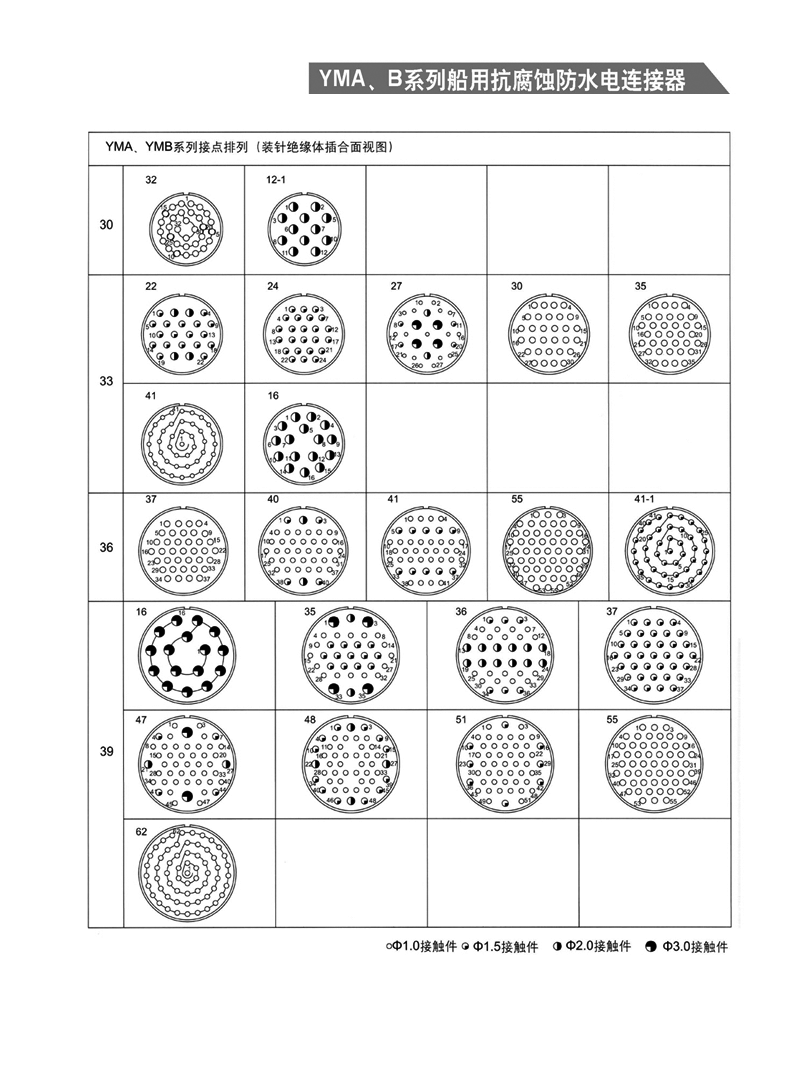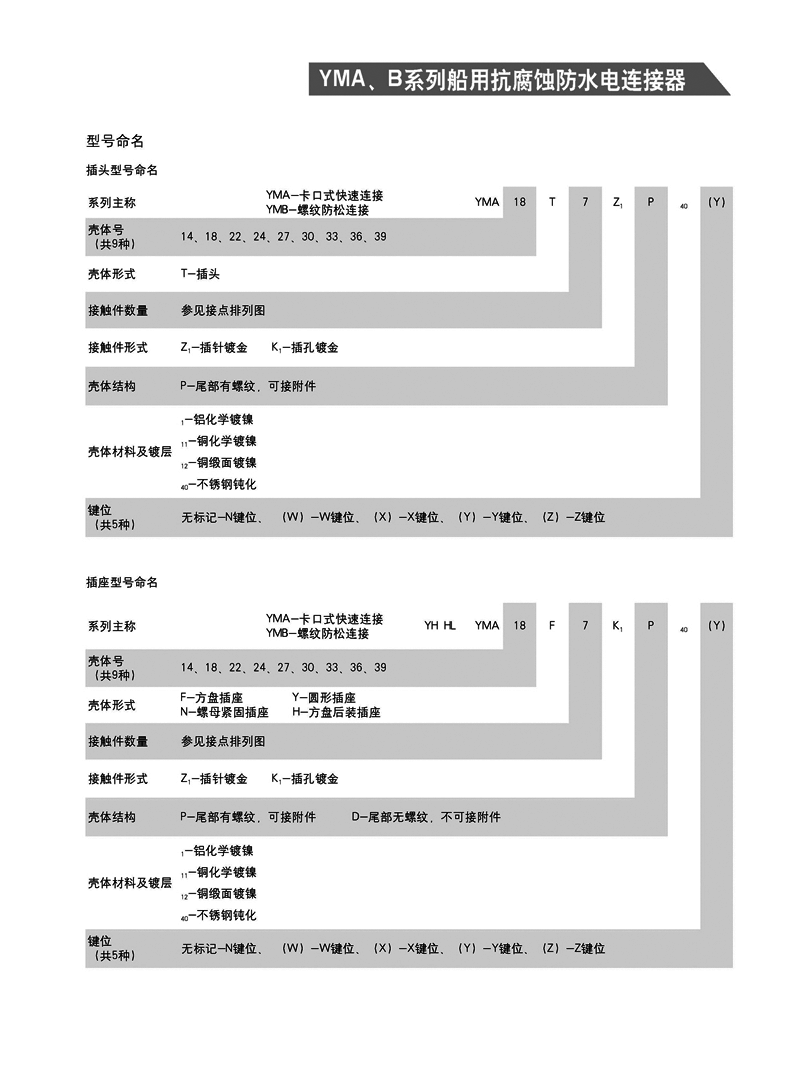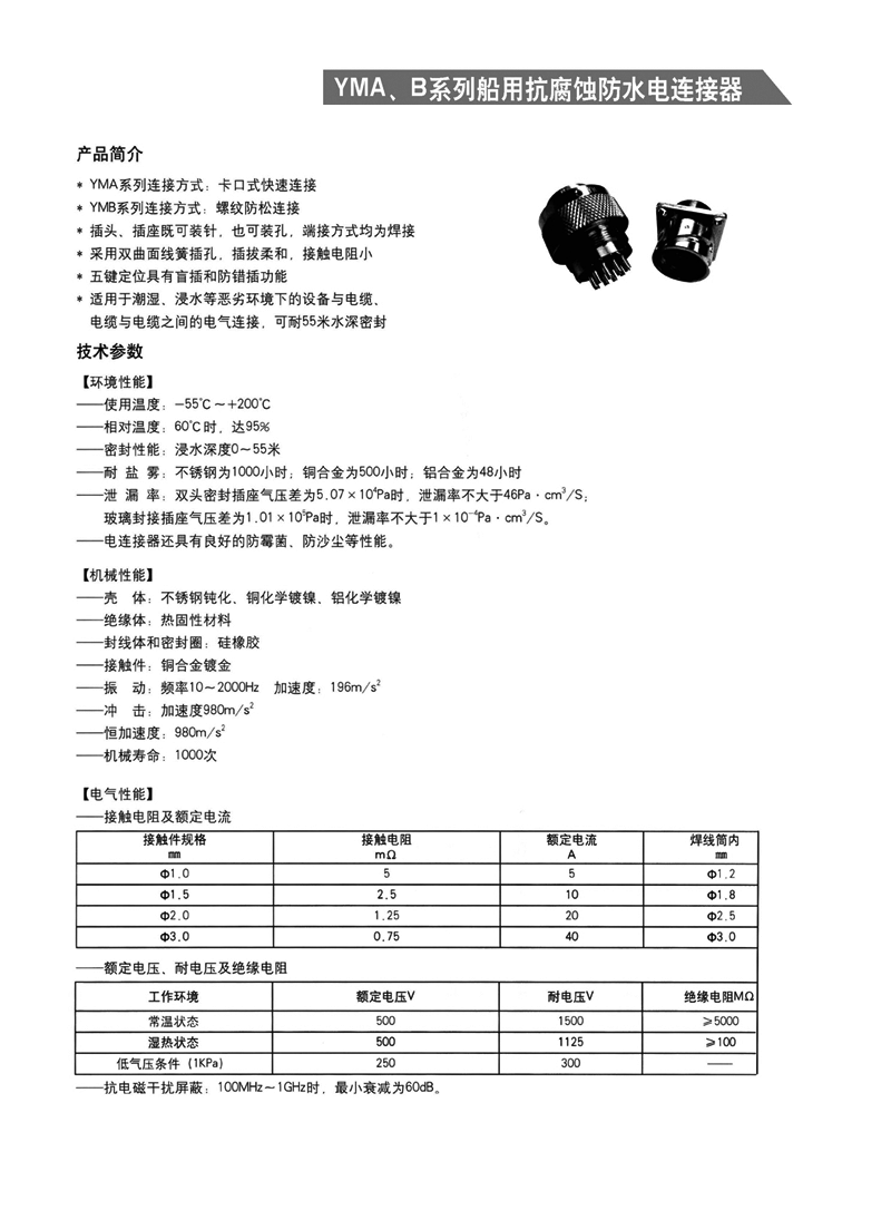 YMA YMB圓形防水防腐航空插頭,適用于濕熱、浸水等惡劣環(huán)境,可耐50米水深密封,耐1000小時鹽霧試驗:YMA系列為卡口式快速連接,YMB系列為螺紋防松連接,頭座均為焊接。 YMA、YMB系列船用抗腐蝕防水電連接器 1.【概 述】 * YMA系列—— 卡口式快速連接 * YMB系列—— 螺紋防松連接 * 適用于潮濕、浸水等惡劣環(huán)境下的設(shè)備與電纜、電纜與電 纜之間的電氣連接 * 可耐50米水深密封 * 插頭插座端接方式均為焊接 * 五鍵定位具有盲插和防錯插功能 * 高可靠的雙曲面線簧插孔使連接器插拔柔和,接觸電阻小 * 插頭、插座既可裝針,也可裝孔 http://www.bj-zql.net/Product/yuanxinghangkongchatouhangkongjiechajian/