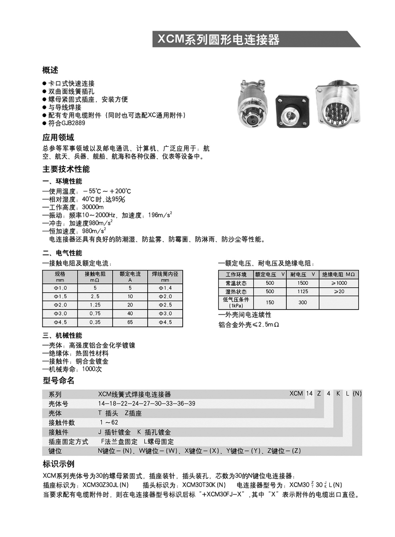 XCM系列螺母拼緊式航空插座,XCM系列航空插頭采用卡口式快速連接和分離;雙曲面線簧插孔,插拔柔和;螺母緊固式插座,安裝方便;接觸件為焊接式,配有專用電纜附件;同時也可選配XC通用附件,符合GJB2889標(biāo)準(zhǔn)。廣泛應(yīng)用于航空、航天、兵器、艦船、總參等軍事領(lǐng)域以及郵電通訊、計算機(jī)、航海和各種儀器、儀表等設(shè)備中。