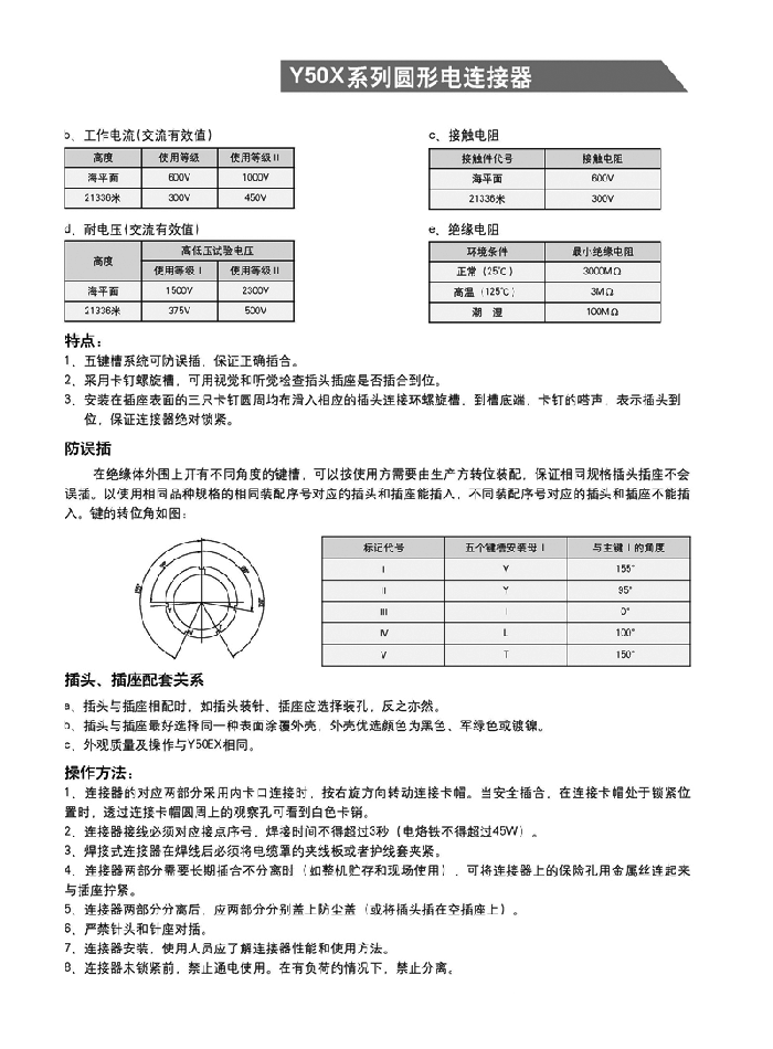 Y50系列航空插頭包括公制、英制、電源三大類電連接器。均為內(nèi)螺旋槽卡銷鎖緊式。具有快捷連接與分離,體積小、重量輕,密封性能好,抗拉性能優(yōu)之特點。插頭電纜罩有七種安裝方式,殼體分屏蔽與非屏蔽,電纜引出有直式和彎式,端接方式為焊接式。品種多,規(guī)格全。Y50X是公制航空插頭,相對體積要大些。而且該產(chǎn)品可根據(jù)用戶需求改裝成濾波連接器,真空氣密封連接器。 均參照GJB101A—97,GJB598A—96,MIL—C—26482等標(biāo)準(zhǔn)的要求。適用于戰(zhàn)略、戰(zhàn)術(shù)系統(tǒng),野外作業(yè)等電訊號、電能的連接。