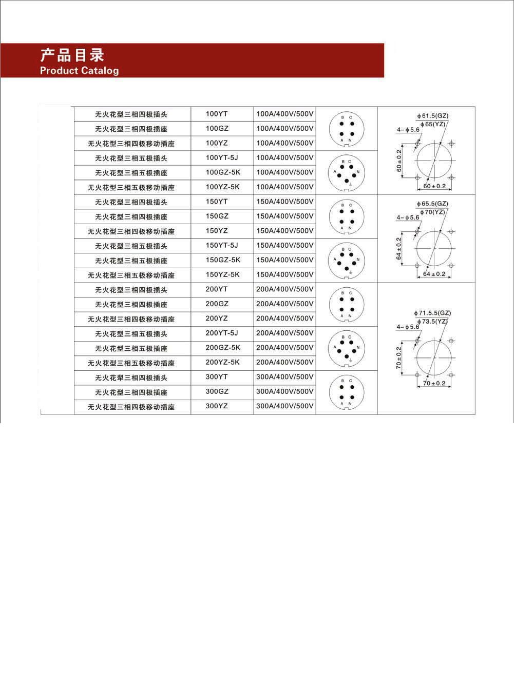 4芯300A防爆防火花航空電連接器,由插頭和插座兩部分組成,其中插頭為移動式(YT),插座有3種形式選擇:①面板固定式(GZ)、②移動式(YZ)和③斜式固定式。