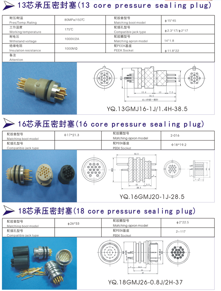 13芯,15芯,19芯高壓真空密封塞,采用進(jìn)口PEEK材料,經(jīng)過高溫,制模燒結(jié),真空度達(dá)1*10-3pa,承受140Mpa 壓力,