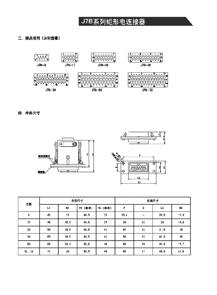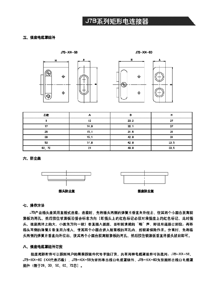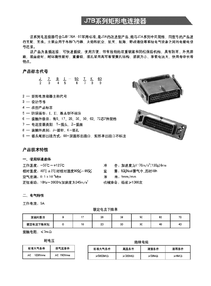 J7B矩形電連接器符合GJB176A-97軍用標(biāo)準(zhǔn),是J7A的改進(jìn)型產(chǎn)品,能與J7A系列中同規(guī)格、同型號(hào)的產(chǎn)品進(jìn)行互配、互換。主要應(yīng)用于各種飛行器、火炮和航空、航天、航海、野戰(zhàn)通信等系統(tǒng)電氣設(shè)備之間的電能電信號(hào)連接。 J7B矩形航空插頭為直插連接,可快速插拔,使用方便,帶有獨(dú)特的雙重鎖緊和防松保險(xiǎn)機(jī)構(gòu),具有防雨,外殼屏蔽,插座密封,耐環(huán)境好,重量輕,插孔采用高可靠管簧孔結(jié)構(gòu),插拔力小,承載電流大,使用壽命長(zhǎng)等特點(diǎn)。