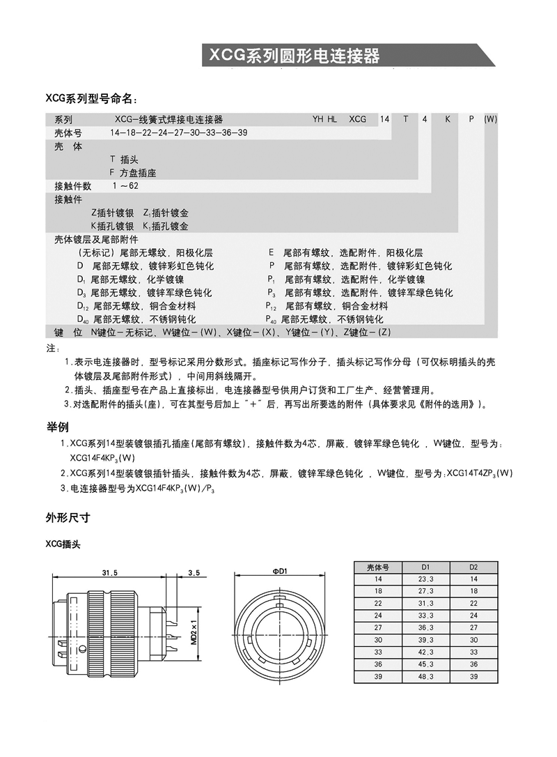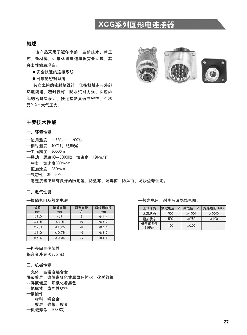 XCG系列防水型航空插頭是在XC基礎(chǔ)上開發(fā)的高性能產(chǎn)品,可與XC完全互換。該系列產(chǎn)品的高性能主要表現(xiàn)在: 1. 可靠的密封系統(tǒng):頭座之間的密封墊設(shè)計,使接觸觸點與外部環(huán)境隔絕,密封性好,防水汽能力強。頭座內(nèi)部的密封層設(shè)計,使連接器具有氣密性,可承受0.3個大氣壓力。 2. 快速安全的連接系統(tǒng),操作簡便,連接可靠。主要應(yīng)用于艦船等各種惡劣環(huán)境領(lǐng)域。