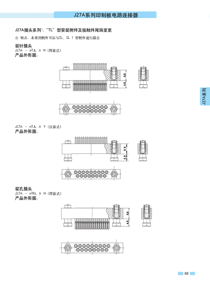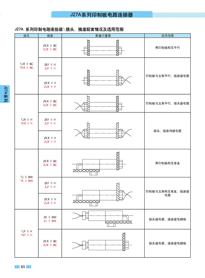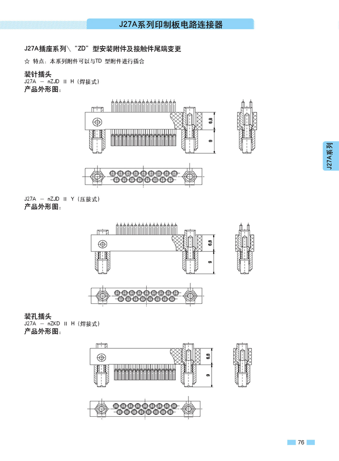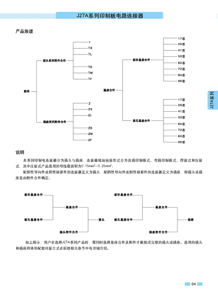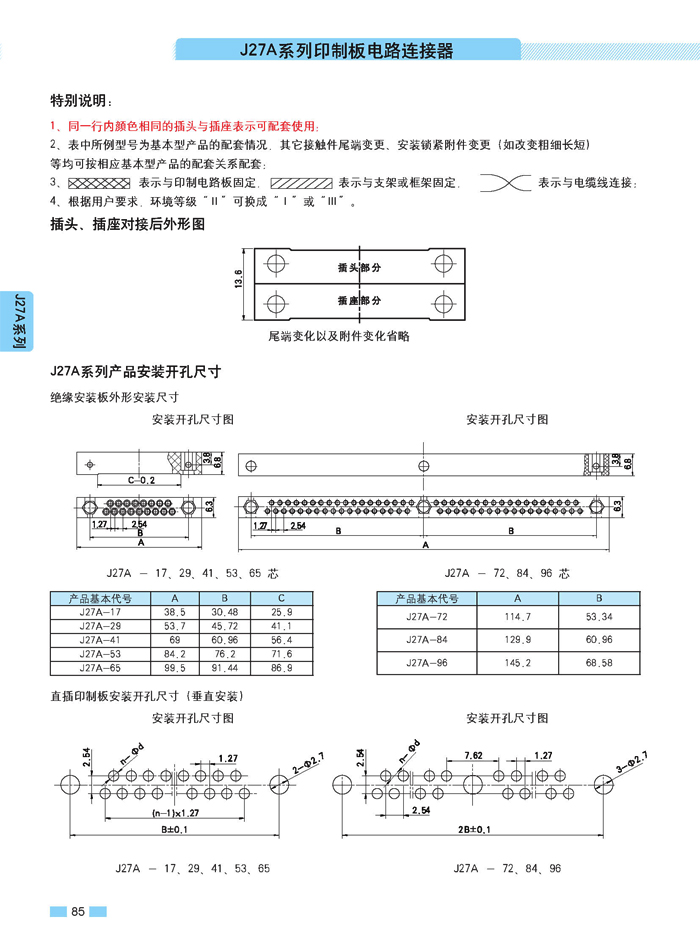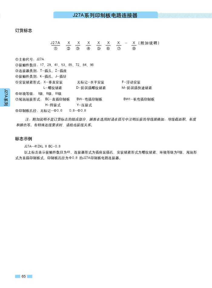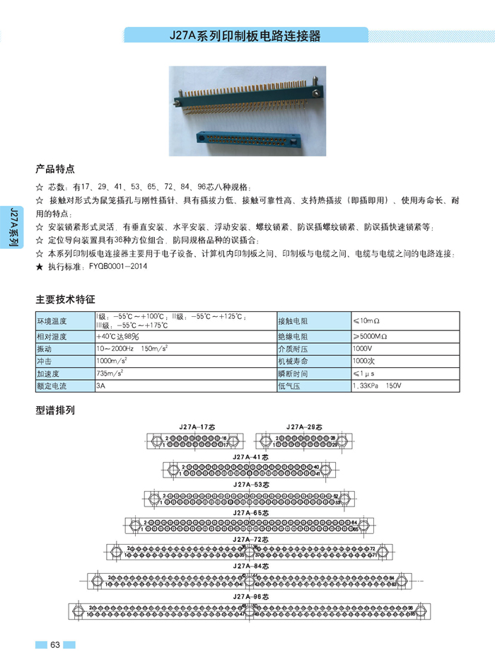 J27A系列印制板電路連接器,符合IEC130標(biāo)準(zhǔn)和MIL-C-55302標(biāo)準(zhǔn)要求,接觸數(shù)目有17,29,41,53,65,72,84,96芯等規(guī)格,連接器尾端端接形式分為直插印制板式、彎插印制板式、焊接式和壓接式,安裝鎖緊形式靈活,定位導(dǎo)向裝置有36種方位組合,具有很強(qiáng)的防誤插功能。http://www.jshkdz.com/product.asp?parentid=2