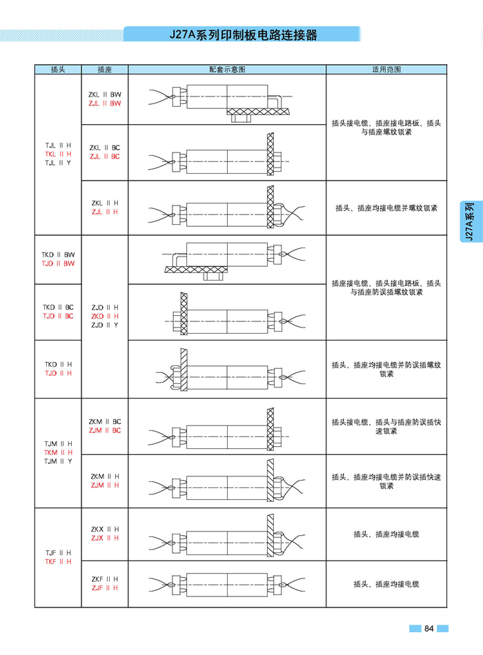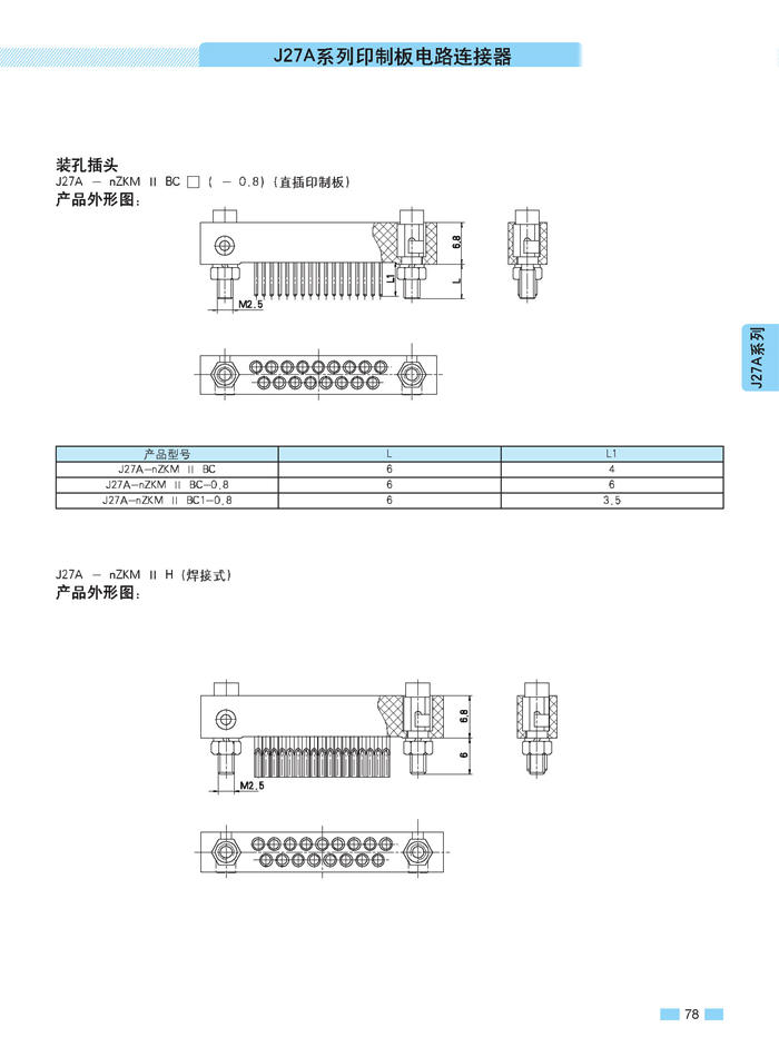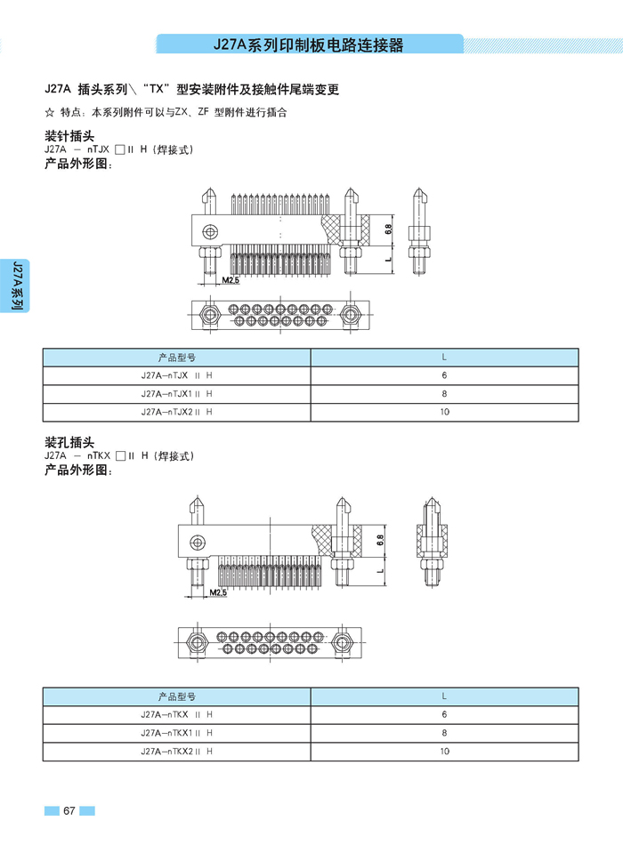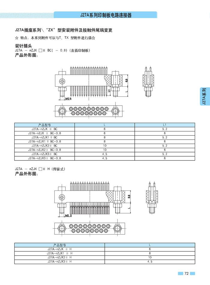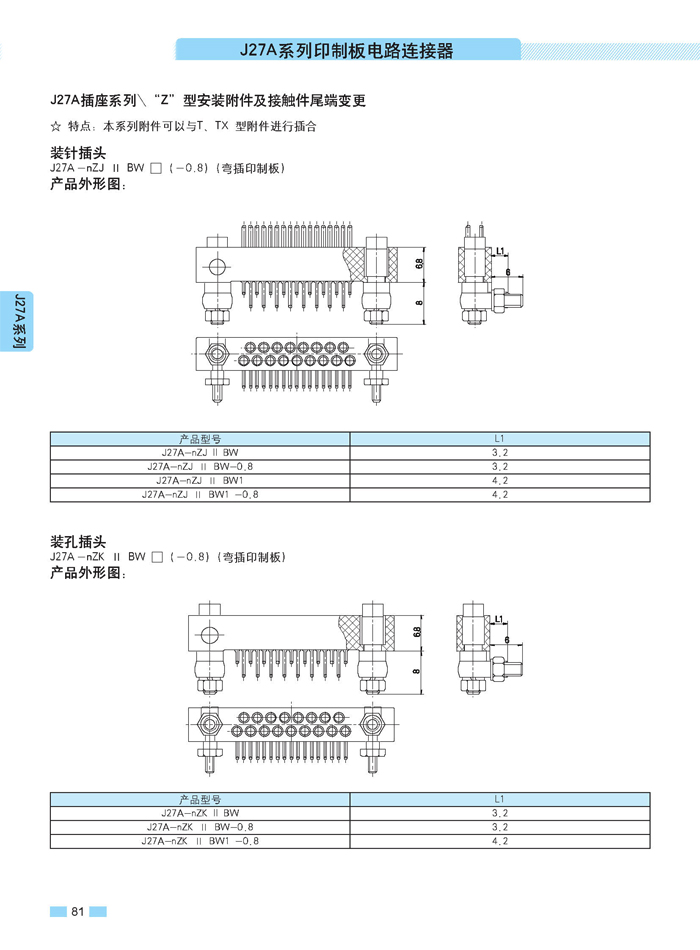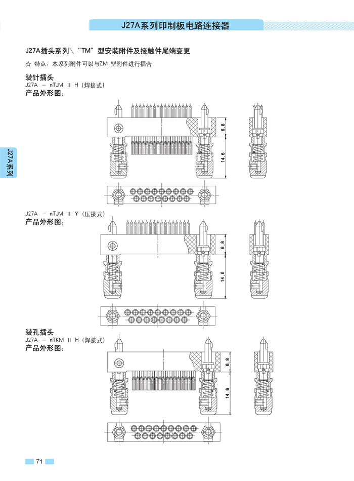 J27A系列印制板電路連接器,符合IEC130標(biāo)準(zhǔn)和MIL-C-55302標(biāo)準(zhǔn)要求,接觸數(shù)目有17,29,41,53,65,72,84,96芯等規(guī)格,連接器尾端端接形式分為直插印制板式、彎插印制板式、焊接式和壓接式,安裝鎖緊形式靈活,定位導(dǎo)向裝置有36種方位組合,具有很強(qiáng)的防誤插功能。http://www.jshkdz.com/product.asp?parentid=2