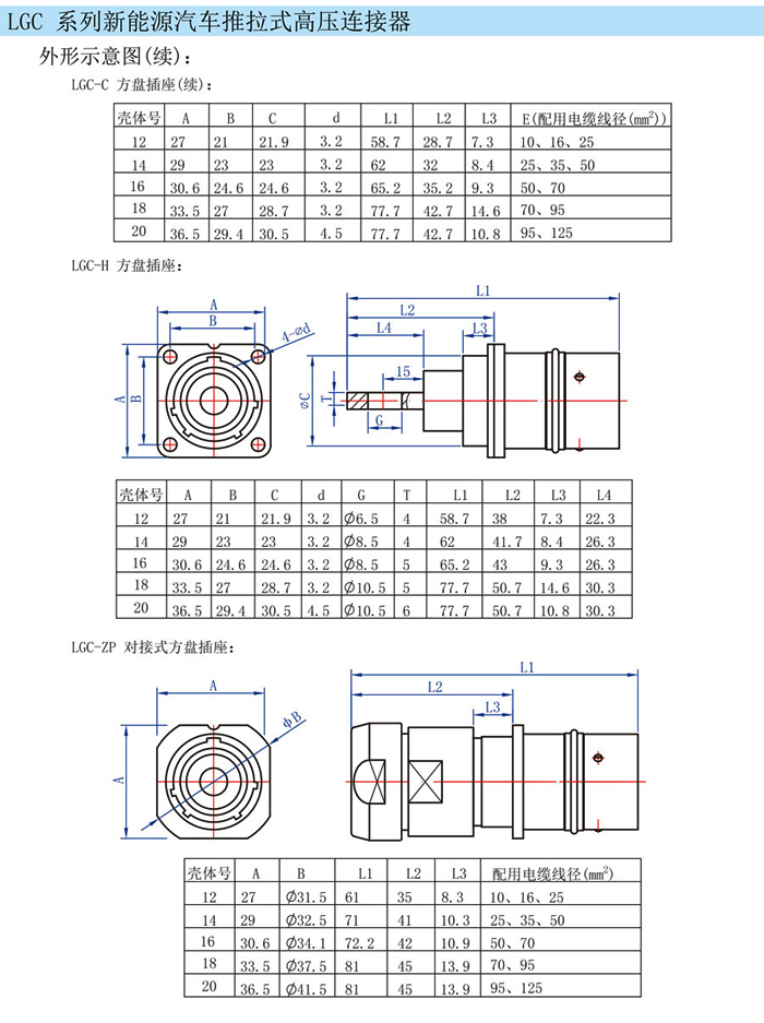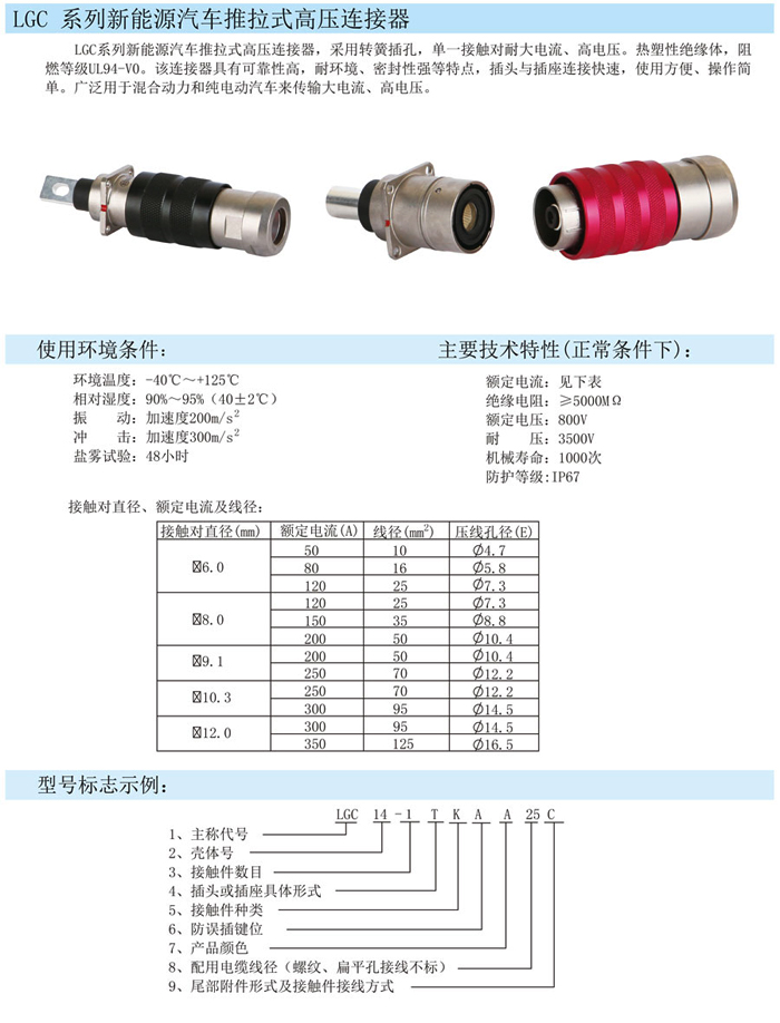 LGC汽車充電高壓直插連接器,用途廣泛,電動汽車,充電樁,新能源公交車,單項輸送電流設備。該充電連接器電流大,可以接25mm2-50mm2線,電流125A-200A.顏色分紅,黑,藍,預防插頭與插座的誤插,采用推拉插拔,方便快捷。