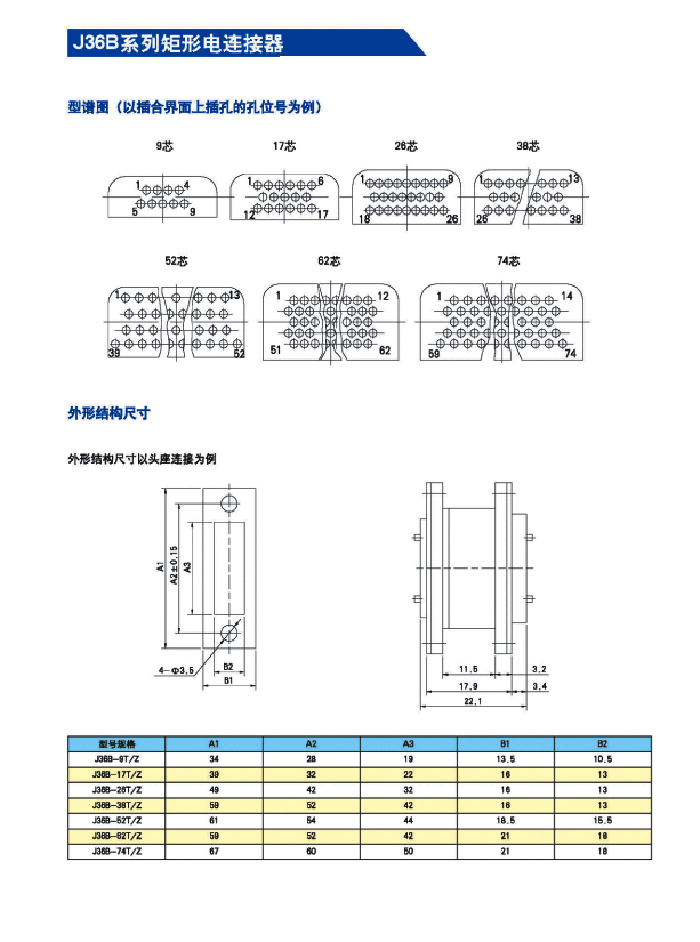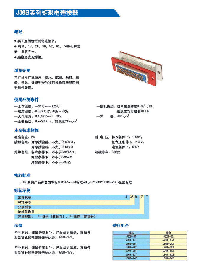 J36B系列矩形航空插頭, J36B系列軍用矩形電連接器,執(zhí)行Q/HD20038-2007詳細(xì)規(guī)范,屬于直插機(jī)柜式電連接器,有9,17,26,38,52,62,74等七種芯數(shù),規(guī)格齊全,其端接形式為焊接。廣泛應(yīng)用于航天、航空、兵器、艦船、通訊、計算機(jī)等行業(yè)的設(shè)備儀器艙內(nèi)部電信號連接。