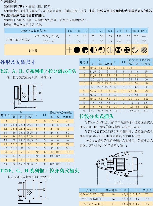 Y27B-2001ZJBM/TKL推拉鎖緊圓形電連接器,接觸件單芯,200A電流,電流大,推拉插拔,快捷牢固,該類大電流型號(hào)多,有3芯,3芯,電流達(dá)到250A.適合用于安裝空間小的地方,插拔方便。http://www.bj-zql.net/Product/yuanxinghangkongchatouhangkongjiechajian/