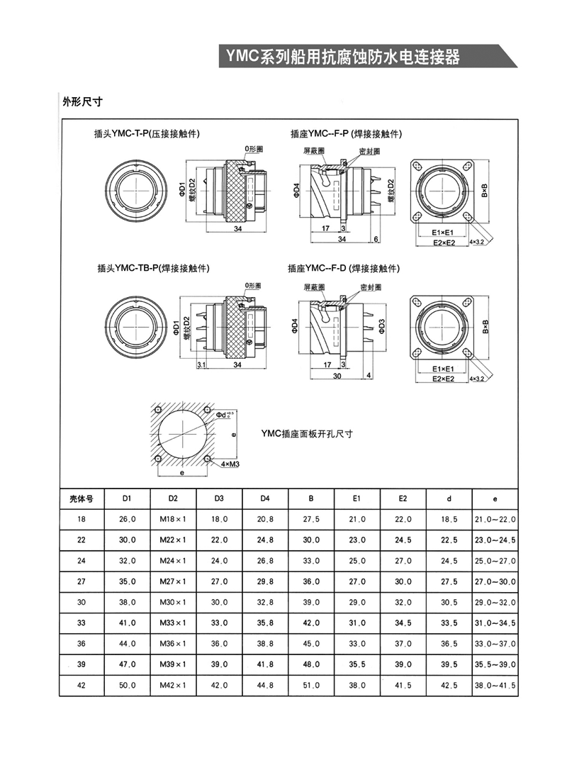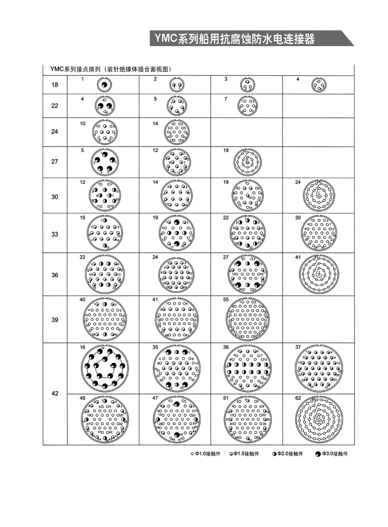 YMC系列船用抗腐防水電連接器, 1. 適用于潮濕、浸水等惡劣環(huán)境下的設(shè)備與電纜、電纜與電纜 之間的電氣連接 2. 可耐50米水深密封 3. 卡口式快速連接 4. 插頭端接方式為壓接,插座為焊接 5. 五鍵定位具有盲插和防錯(cuò)插功能 6. 高可靠的雙曲面線簧插孔使連接器插拔柔和,接觸電阻小 7. 插頭、插座既可裝針,也可裝孔。