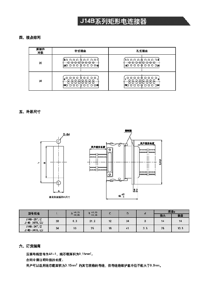在J14A系列連接器外殼的基礎(chǔ)上,增加了接觸件的密度和防雨功能。帶電纜,端接形式為壓接,電纜規(guī)格和長度由用戶確定。