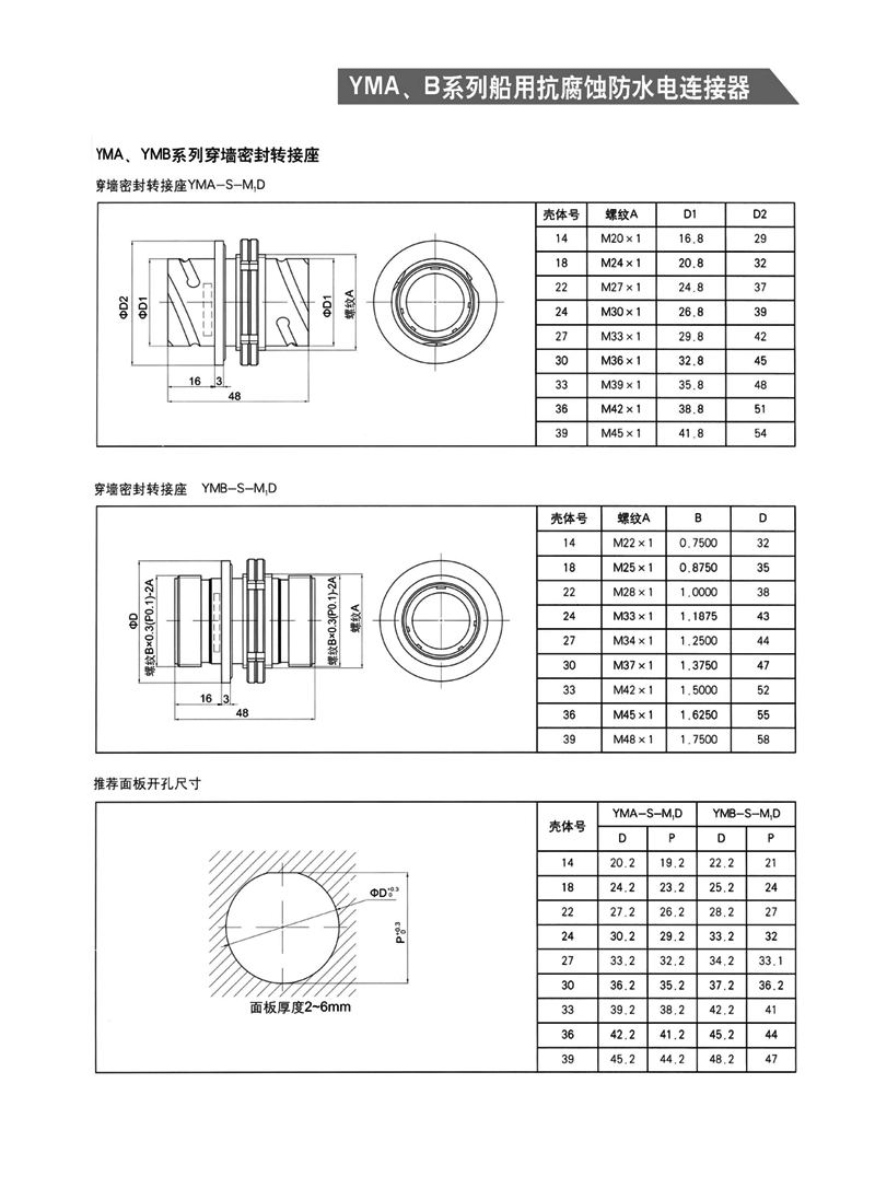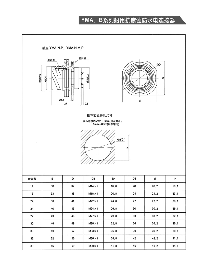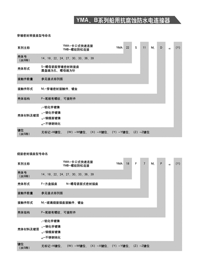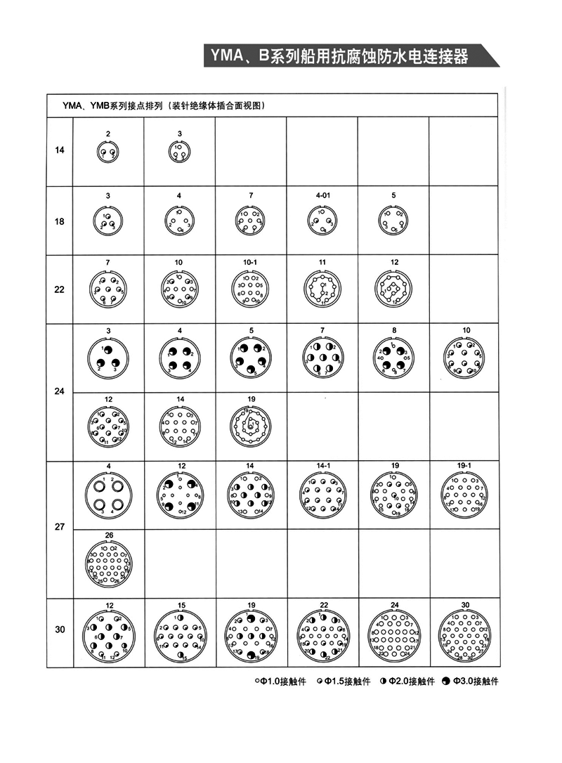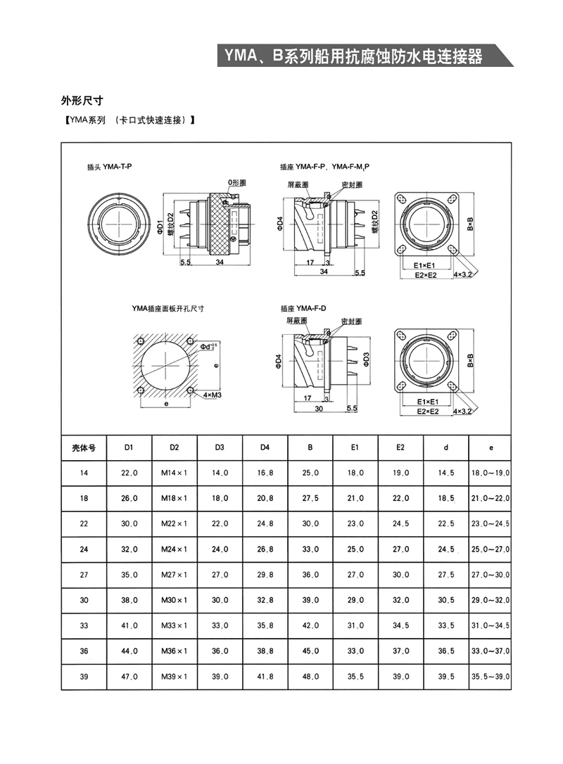 YMA/YMA系列船用防水航空插頭適用于濕熱、浸水等惡劣環(huán)境,可耐50米水深密封,耐1000小時(shí)鹽霧試驗(yàn):YMA系列為卡口式快速連接,YMB系列為螺紋防松連接,頭座均為焊接。 適用于潮濕、浸水等惡劣環(huán)境下的設(shè)備與電纜、電纜與電纜之間的電氣連接。