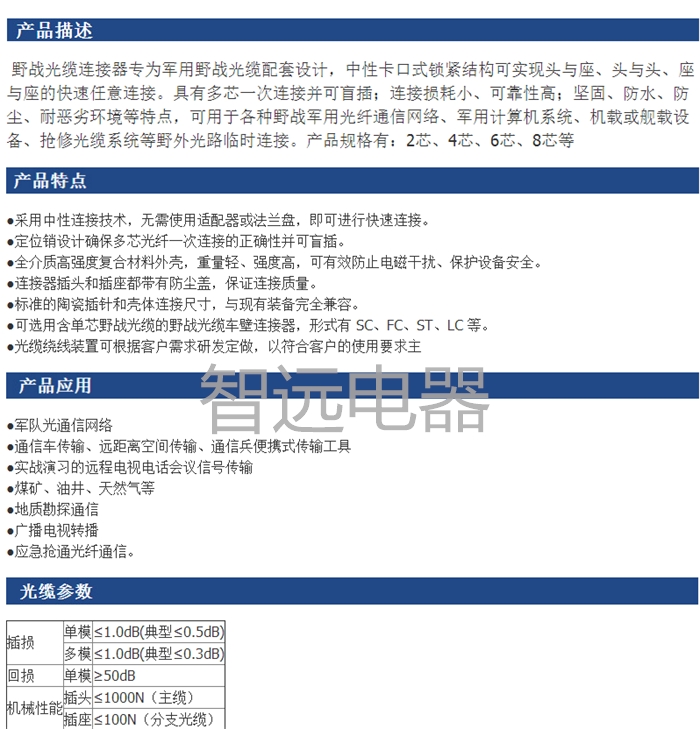 GYZ32光纖活動連接器哪家生產(chǎn)? 專為軍用野戰(zhàn)光纜配套設(shè)計,中性卡口式鎖緊結(jié)構(gòu)可實現(xiàn)頭與座、頭與頭、座與座的快速任意連接。具有多芯一次連接并可盲插;連接損耗小、可靠性高;堅固、防水、防塵、耐惡劣環(huán)境等特點,可用于各種野戰(zhàn)軍用光纖通信網(wǎng)絡、軍用計算機系統(tǒng)、機載或艦載設(shè)備、搶修光纜系統(tǒng)等室外光路臨時連接。 本公司從事野戰(zhàn)光纜連接器研制多年,基于對組裝工藝的深刻理解,針對部隊實際應用的不斷改進,和成本的逐步降低,致力將成熟的野戰(zhàn)光纜連接器向民品市場推廣。服務熱線:0523-87592697